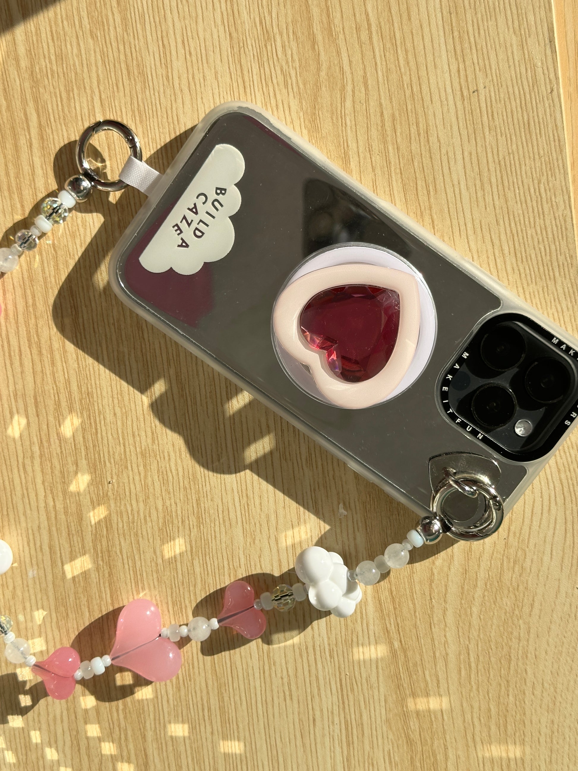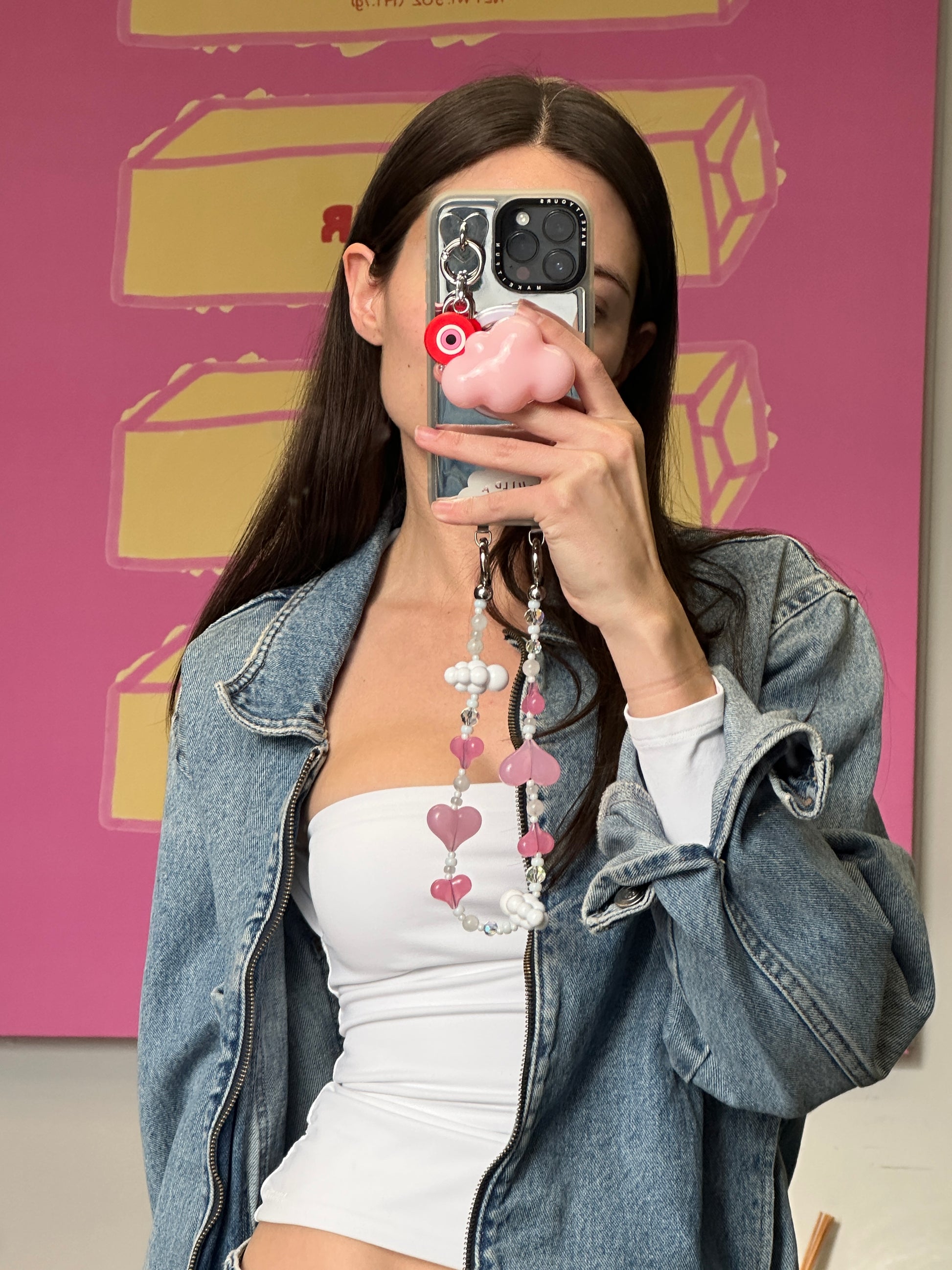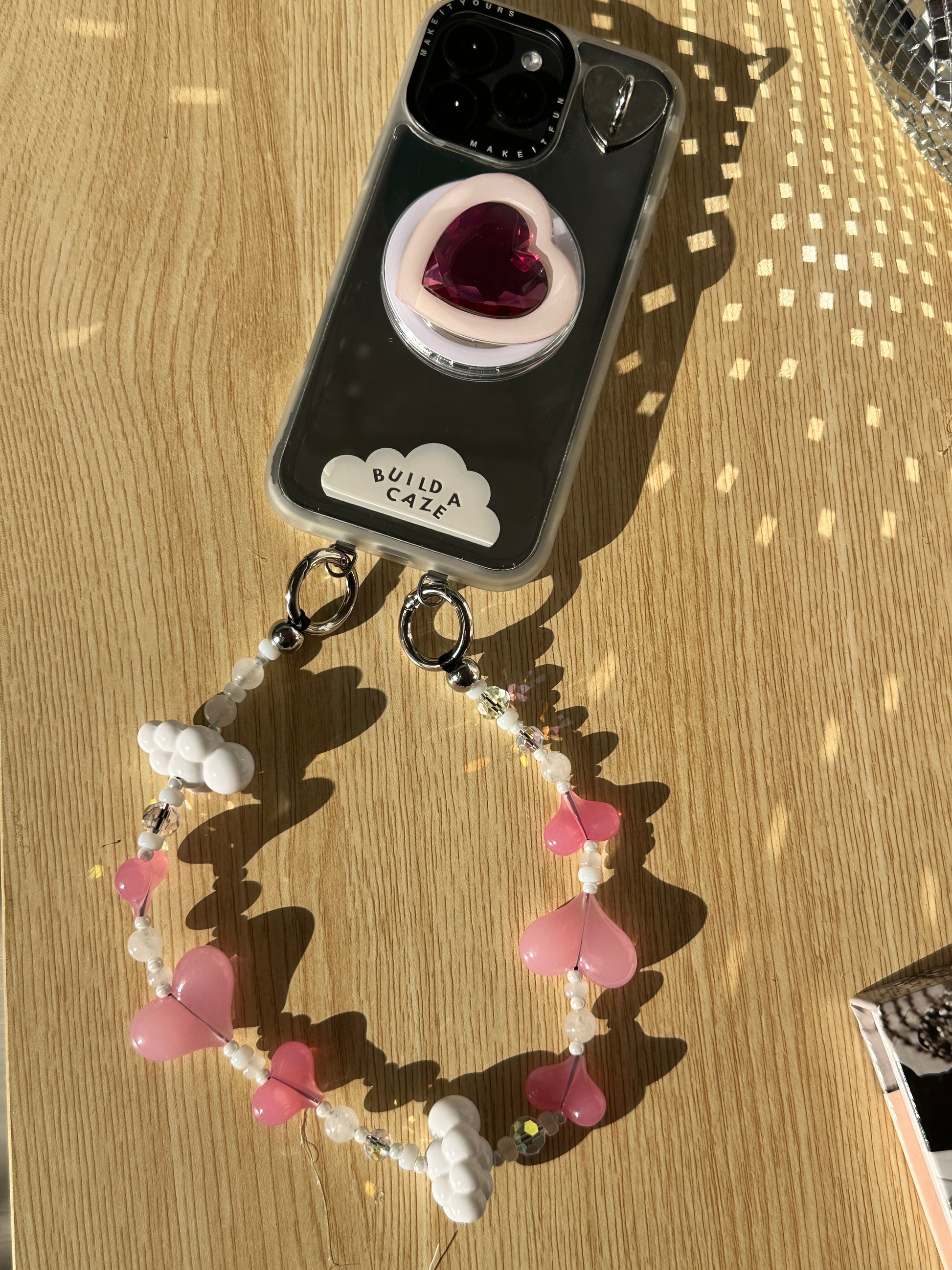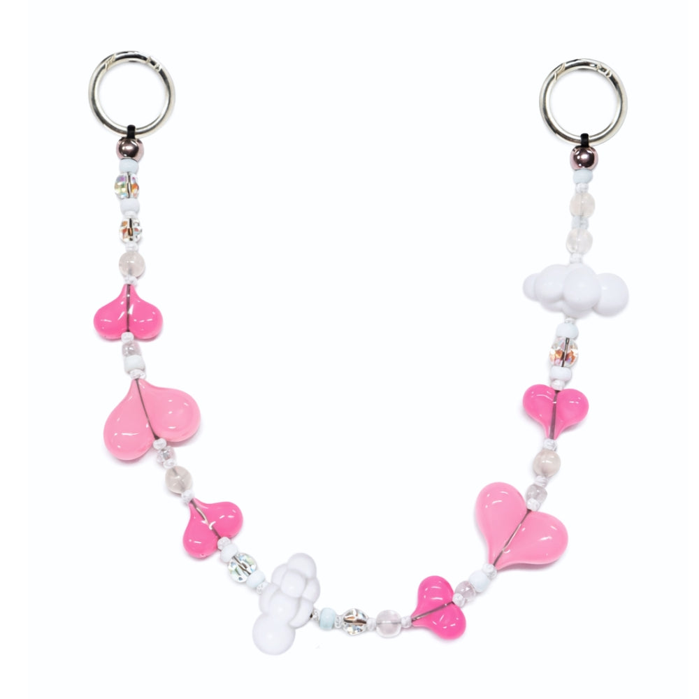 Flotando en las nubes. Esta correa tiene corazones rosa pastel y nubecitas blancas para una estética de ensueño. Es el accesorio ideal para las que siempre tienen la cabeza en las nubes y el cel en la mano.